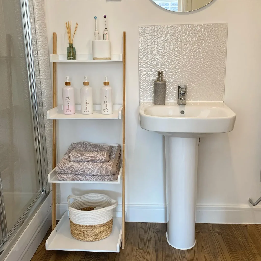 Towel ladders are another great option. These are wooden ladders that lean against the wall. They rest on the floor and lean on the wall. No mounting required. You drape towels over the rungs. It adds texture to the room and solves the “where do I put my bath sheet” problem.